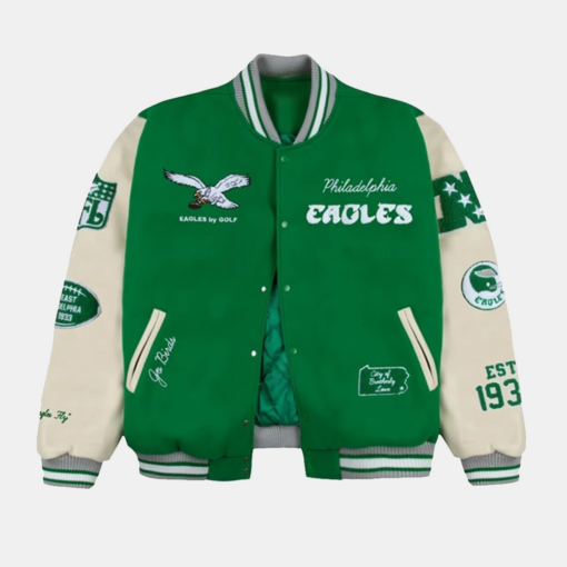 Street style meets team spirit in the Philadelphia Eagles GOLF WANG Letterman Jacket, a bold...